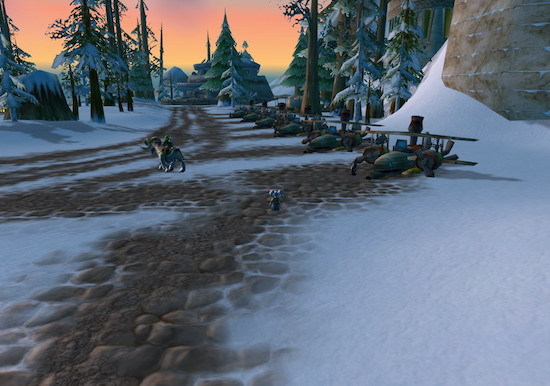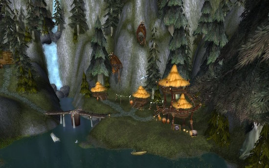 与铁炉堡机场跑道一样,欢乐巨魔村也是一处位于飞行航线下的特色地点。它地处黑海岸、费伍德森林和月光林地三个区域的交汇处,隐藏在崇山峻岭之间,远离尘嚣,许多巨魔在这里终日纵情歌舞,是艾泽拉斯为数不多宁静而祥和的乐土,宛如陶渊明笔下的世外桃源。在《巫妖王之怒》上线前,玩家可以在费伍德森林飞身跳入,而WLK上线之后则因加入了一道空气墙而彻底与世隔绝。在《大地的裂变》上线后,这里被命名为"碎矛谷",成了一处任务区域。