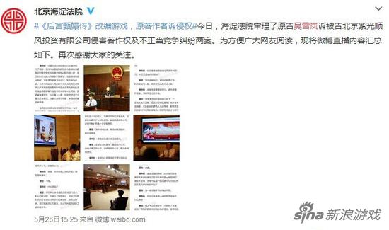 5月26日,北京海淀法院审理了吴雪岚(笔名:流潋紫)诉被告北京紫光顺风投资有限公司侵害《后宫甄嬛传》著作权及不正当竞争纠纷两案。