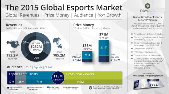 根据Newzoo最新的研究指出,观看电子竞技赛事的人数比去年提升了6%,而持续参与电子竞技相关赛事的总人数也快速成长,这表示越来越多人主懂参与(观看)电子竞技赛事;而与去年相比,今年1至5月的比赛总奖金也已是去年的2倍,以这样的趋势来看,Newzoo推测2015年一整年的奖金总额将达到7100万美金(4.4亿RMB)。