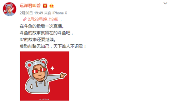 早在前几日,身为斗鱼户外一哥的远洋君便微博宣布2月28日将是在斗鱼的最后一次直播,其中一句“37的故事还要继续”给粉丝留下了无数的悬念。