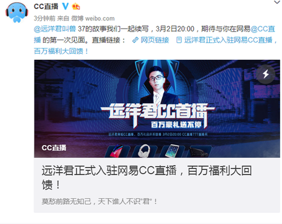 如今随着CC直播官方微博宣布,终于让远洋君的户外粉丝们吃了一个定心丸。在新的一年里,这位身上贴着“富二代”、“人气户外一哥”等标签的富公子正式签约网易旗下的CC直播平台。
