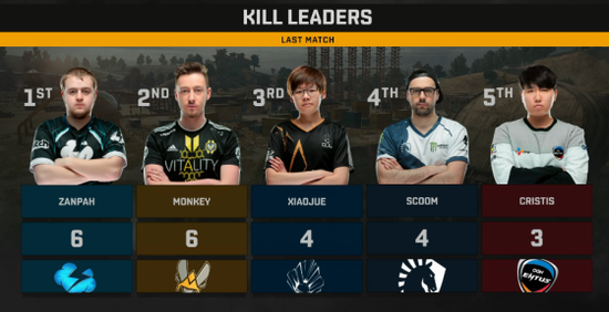 不过决赛圈没有眷顾GOL,随着图拉夫“杂技摩托”卡门摔死自己,小绝冲锋阵亡GOL灭队。被毒圈眷顾了的Liquid反身干掉C9,炸飞最后OGN独狼后,再吃一鸡。不过小绝在这局比赛发挥出色击杀四人上榜。