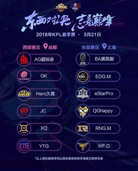 目前东西部俱乐部分区名单已经确定。东部赛区由BA、EDG.M、eStarPro、QGhappy、RNG.M、WF.D这6支俱乐部组成,比赛主场留驻上海;西部赛区则由AG超玩会、GK、Hero、JC、XQ、YTG组成,比赛主场西迁成都,成都也随之成为王者荣耀职业联赛最为重要的培育土壤。