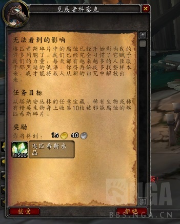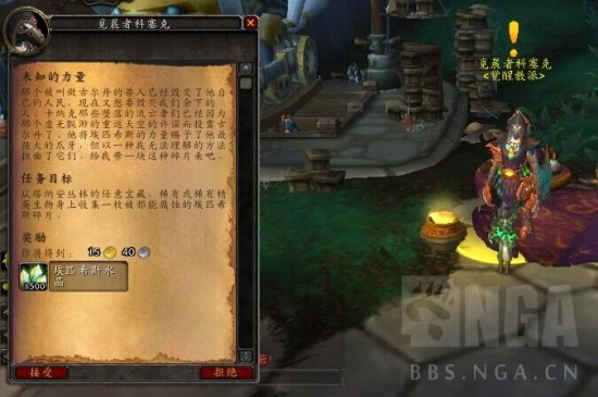 从觅晨者科塞克处可以获取前序任务[未知的力量],任务要求收集1枚被邪能腐蚀的埃匹希斯水晶,完成后奖励1500声望。