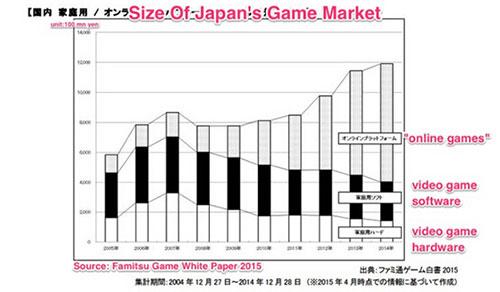 2014年日本游戏市场收入96亿美元,年比年增长4%,其中移动游戏收入占比超过50%。Famitsu将移动游戏归类为“在线游戏”的一个子类别(注:在线游戏收入包括PC游戏),称2014年日本在线游戏总收入达到64亿美元,比2013年增长了13%。