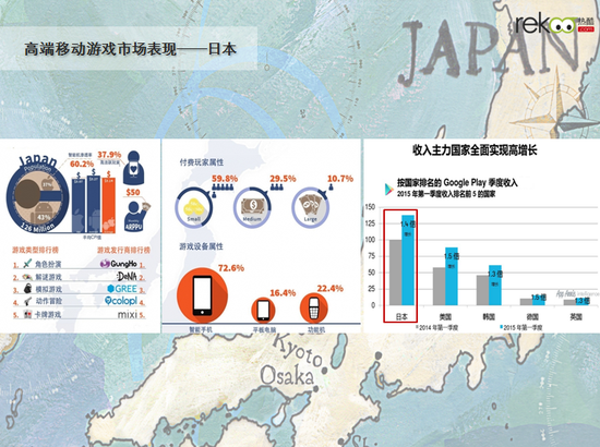 在谈及海外市场的状态时,热酷游戏CEO刘勇表示,相比于国内游戏市场,以日本市场为代表的高端海外市场,进入壁垒更高,是全球最难打入的移动游戏市场之一,其优质程度让中国游戏厂商垂涎三尺。2015年Q1,日本iOS和Google Play应用商店中,90%以上的收入来自于游戏,为全球最高。玩家通过应用内消费为游戏贡献的人均收入(ARPPU)大约为每月50美元,其中小R为59.8%、中R为29.5%、大R为10.7%,这四项指标均远高于国内市场。与此同时,日本Android智能机用户每月玩手机游戏的平均时间是其他用户的2倍。无论是用户质量还是市场潜力,日本市场都是一块香气诱人的奶酪。