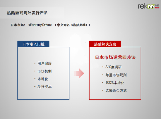 通过多年在高端海外游戏市场的运营与积累,热酷游戏总结出一套完整的“日本市场发行四步法”,用以应对日本市场严苛的准入门槛。
