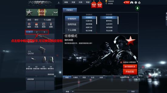 装备系统共三个背包,用来装备不同的武器和技能,玩家可以随意切换背包。 背包选择界面:进入游戏时出现,可用鼠标点击想要装备的背包。在游戏过程中可随时按“~”键切换背包,新的选择将在下次重生时生效。