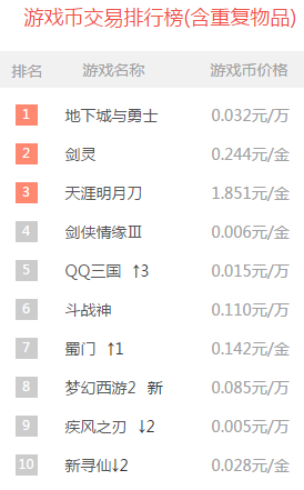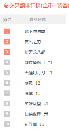 本周游戏币交易排名:本周新上榜的有《梦幻西游》出现在排名里,位列第8,《疾风之刃》下滑两名,《斗战神》、《QQ三国》稳居位列第6第7名,恭喜《天涯明月刀》挤进前三!;而上周《龙之谷》这周已经消失不见了。
