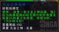 沃金之锋战旗:放置一面沃金之锋战旗,每2秒为战旗周围45码范围内的所有盟友恢复5%的最大生命值,持续30秒。