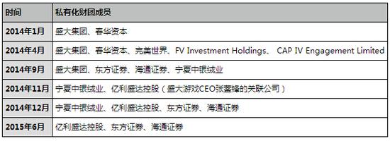 2014年9月,春华资本、完美世界、FV Investment Holdings和CAP IV Engagement Limited四方从买方财团中退出,取而代之的是东方证券、海通证券和宁夏中银绒业三方的加入。这也是中银绒业首次出现在盛大游戏私有化财团中。彼时市场传言称,世纪华通和中银绒业将共同收购盛大游戏。