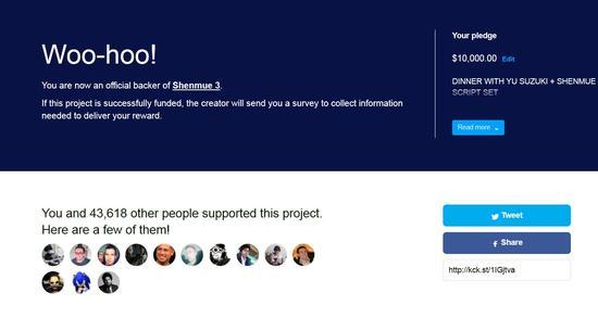 《莎木3》在Kickstarter上开启了众筹,如果经济实力允许,或许许很多该系列游戏的玩家都想选择10000美元的募捐金额,因为你不仅可以得到《莎木1》、《莎木2》的剧本,在游戏中留下你的名字,甚至可以和铃木裕共进晚餐!然而回归现实,有多人能负担的起这10000美元的捐款呢?