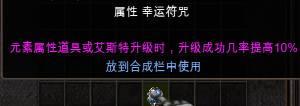 【属性幸运符咒】:元素属性道具或者艾尔特道具升级时,升级成功几率提升10%。