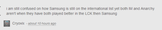 原文翻译:我对三星仍能跻身前二十表示惊呆了,反而IM和Anarchy却不能,但他们在LCK联赛里比三星表现优秀多了。