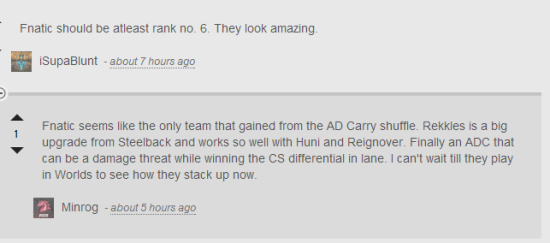 原文翻译:Fnatic的国际排名至少应该第六,他们太出色了。回复:Fnatic是唯一一支从AD获益匪浅的战队,Rekkles比Steelback厉害的多,而且与Huni和Reignover配合默契。最终ADC会在后期成为可怕的火力点,我迫不及待希望看到FNC在世界舞台上的精彩表现了。