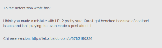 原文翻译:至本文的拳头作者:我觉得你把LPL版块弄错了吧?我很确定Koro1坐板凳是因为合同原因,他甚至在贴吧发帖子说明时间缘由了。(贴吧里说Koro1是因为闹涨工资而与俱乐部发生合同纠纷从而被雪藏。)