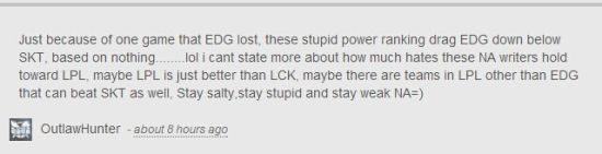 原文翻译:仅仅因为EDG输掉一场比赛就在这愚蠢的排行榜里位居SKT下风?毫无理由.....。。呵呵,我实在难以揣测这些北美作者对LPL的深深恶意,也许LPL比LCK水平高,也许LPL还有其他战队能击败SKT,北美捞比们就继续保持愚蠢,继续弱鸡,继续酸葡萄吧=)