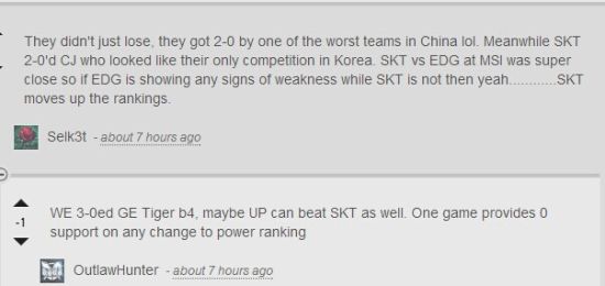 原文翻译:他们不仅仅是输了,而且被LPL最弱队伍2-0击败。与此同时SKT2-0吊打CJ,后者貌似是韩国唯一的挑战者。MSI上SKT vs EDG本来就是实力相差无几的巅峰对决,只不过当时EDG没暴露出弱点来,所以目前SKT能位居第一。