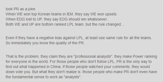 这就是问题所在,他们声称自己是“专业分析师”,给全世界炮制排行榜。对于那些甚少关注LPL的人来说,PR是唯一了解中国发生什么的渠道。但如果这些人看了拳头的评论,他们会把你们轰下台来。他们不了解的是:这些炮制排行榜的“专家”却缺乏最基本的常识。