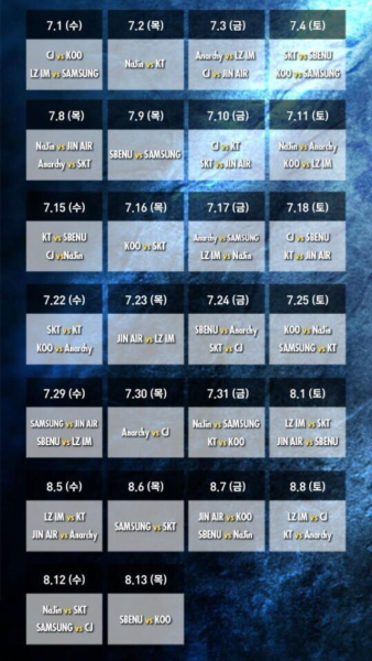 本周末27日晚韩国LCK(OGN)2015夏季联赛将结束第一轮的争夺,在赛程即将过半之际,LCK(OGN)夏季赛第二轮的对阵日程近日公布,10支参赛队伍KOO Tigers,SKT,Najin,KT,CJ,Jin Air,Samsung与IM携晋级队伍Anarchy,SBENU继续征战。赛制BO3,每局比赛过后可更换替补。常规赛前四晋级季后赛。