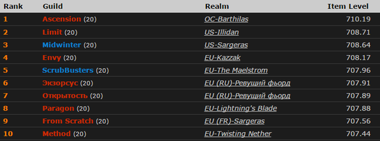- 第一个CD 接近尾声,各大公会的装备积累基本已经定型,之前在T17版本表现出色的澳服公会Ascension暂列装等第一,高达710的装等领先了第二名2点。 Paragon、Method、Exorsus等传统强会均在707左右。国服公会的平均装等在wowprogress中出入较大,应在707-708之 间,甚至更高。