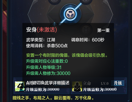 此心法安身技能-主要作用为吸引仇恨,那么此第一个技能当为PVE金牌技能-以傀儡当T,当然,此心法另一个技能-立命-当属团战利器,具体伤害属性稍后测试.