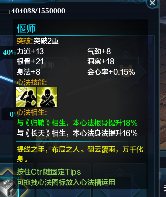 大致属于万金油心法,主属性为根骨、洞察、力道、与归鞘相生。