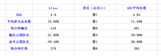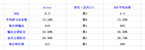 身处排名第八的战队,Altec的KDA却不落下风,并且在输出效率方面超出同类水准。令人惊奇的是,这个才18岁的加拿大小伙子在对英雄造成伤害的百分比排名雄踞第三,并且有着最高的平均击杀数。鉴于他也是队内最能打钱的AD,同其他AD比较起来将资源配给给他能给队伍带来最大的收益,直接表现就是输出暴增,人头数增加。