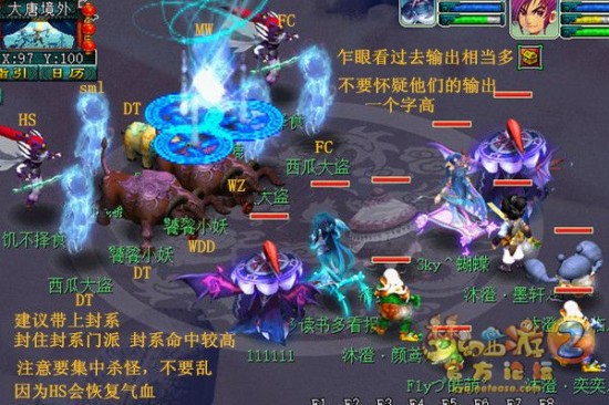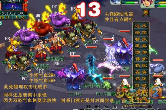 这 个是西瓜精灵中的战斗机,很凶残,所以队伍里还是要齐心协力去杀。我们首先来看下怪物的配置,主怪是LG很凶,然后两边是两个法系门派比主怪略微弱那么一 点点,两边是辅助门派,基本以HS和PT为主。前排的怪门派都会变,不过再怎么变依旧是法系和物理输出。这里晴儿建议大家先把主怪封住,然后从前排小怪依 次点杀。但要记住一次只能封两只,不能太贪心,因为封了两个以上的怪,后排的怪就会玉清。后排的HS和PT耐很高,所以不考虑开始就杀。前排的怪全死光以 后,后排主怪就会暴走成秒10LG了,大家要小心一些,先点杀主怪。主怪死掉以后,旁边的PT怪忽然说了一句话,然后没有经过任何人允许他就自己给自己加 了9000多气血,太恶劣了。这边的话主怪气血45350,小怪气血35684,杀完后109号获得60多W经验。