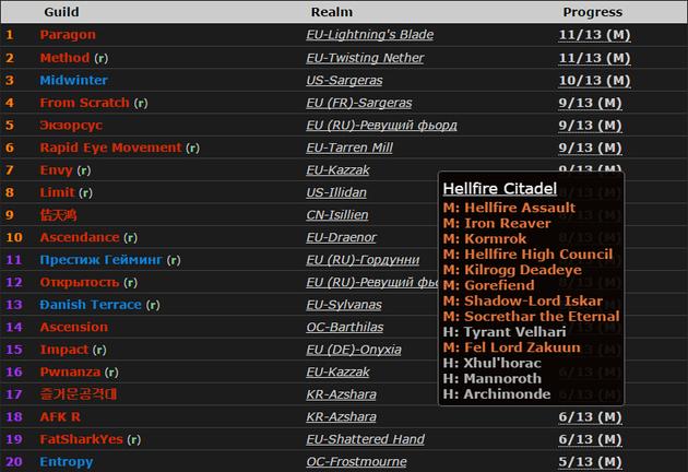 - 世界进度方面,Paragon与Method先后达到11M,领跑全球;Envy在击杀扎昆后,与Midwinter、Fron Scratch、Экзорсус(Exorsus)同为9M并列第二;美服的Limit、国服佶天鸿、欧服Ascendance、欧服俄语区 Престиж Гейминг(Prestige Gaming)以及欧服俄语区Открытость(Openness)同为8M,并列第三。