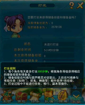 另外就是【储备经验】与【盈福经验】,盈福经验就不解释了,反正小编每周的盈福经验都用不完;储备经验怎么得呢?通过口袋版的打坐可以获得大量储备经验。