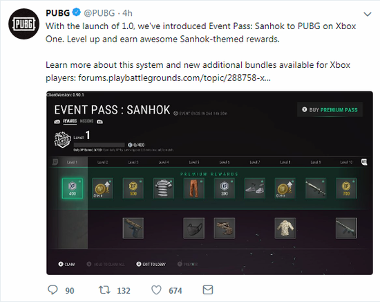PUBG官推今日发布公告,随着绝地求生Xbox 1.0的成功上线,萨诺通行证也在今天成功登陆Xbox,主机玩家们也可以享受到大行动带来的福利了。