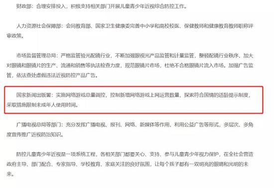另外,上周四,中国教育部等八部门关于印发《综合防控儿童青少年近视实施方案》的通知显示,国家新闻出版署将对网络游戏实施总量调控,控制新增网络游戏上网运营数量,探索符合国情的适龄提示制度,采取措施限制未成年人使用时间。