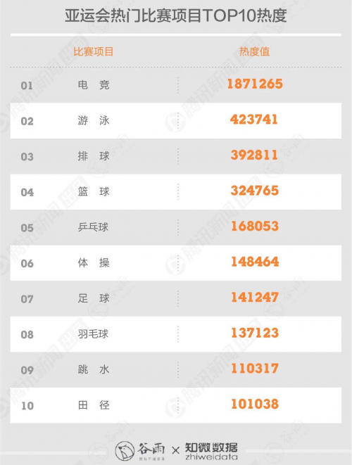 “领奖服门”的游泳?四冠王的篮球?全错!根据谷雨和知微数据最新发布的《亚运会热门比赛项目TOP10热度榜》显示,电子竞技以领先第二名游泳、第三名排球四倍有余的热度值强势登顶。