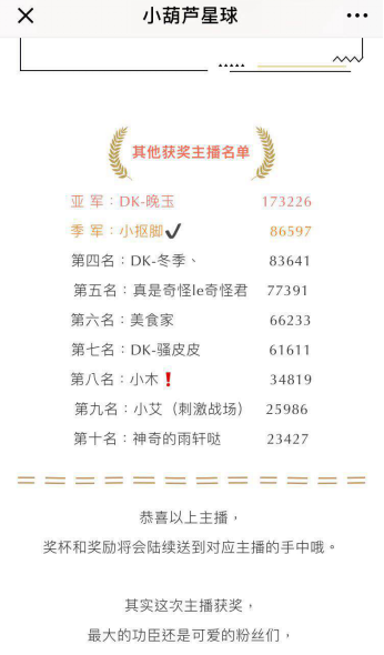 最后胜出的前10名里,全被快手和虎牙承包了,还正好各占5个,本来以为快手这么强呢,还能跟虎牙平分秋色的,没想到快手“吃鸡手游一哥“直接就被虎牙重金挖走了。到底是虎眼的雪亮还是这个比赛用粉丝数据给虎牙签下小抠脚添了一把柴呢?