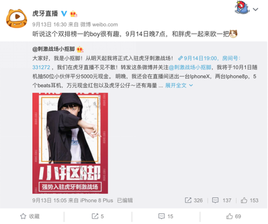 今天刷微博时候,看到虎牙官宣说有新的刺激战场主播加入,我一看这不是原来快手平台的主播吗。虽然现在虎牙官微帮忙转发了微博,但是看评论和转发都没达到一个量级。