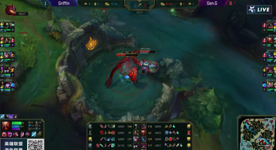 7分钟,GRF的奥拉夫冲进野区杀掉酒桶,随后双方队员都迅速的支援过来在野区发生混战,GEN由于少人,被GRF杀掉三人。
