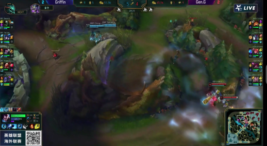 20分钟,GRF的猪妹在野区抓到机会先手开团,但是GEN的纳尔赶来支援,GEN反杀掉GRF的野辅。