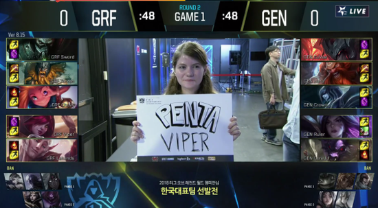 18分钟,GRF的猪妹带动节奏在上路抓死厄加特,随后在中路Crown的维克兹被GRF的剑魔在中路杀掉。GRF的优势越来越大,GEN的形式则不容乐观。