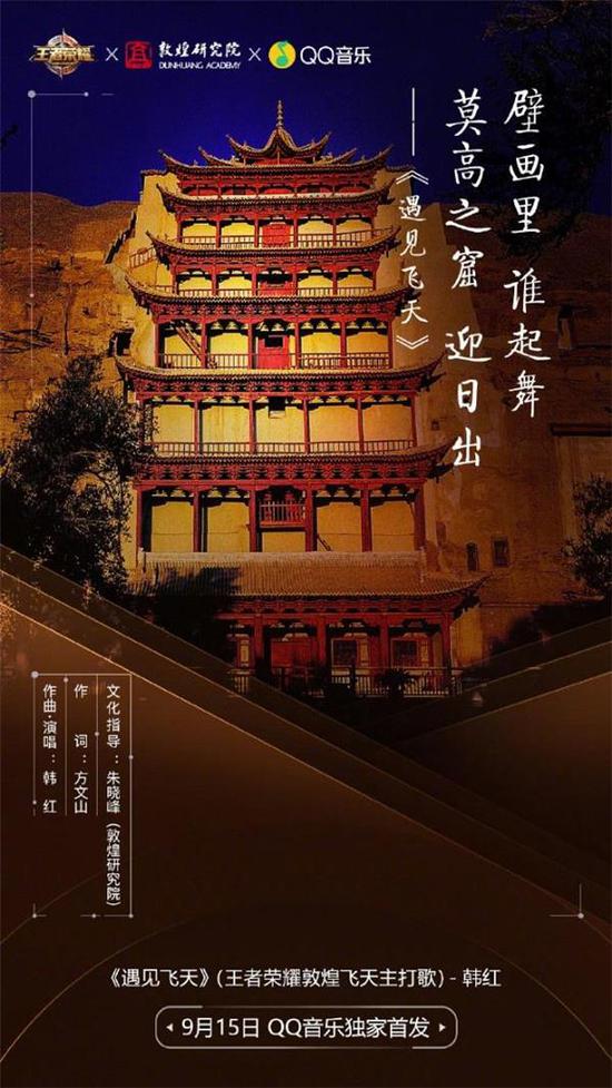 9月15日,王者荣耀和QQ音乐携手敦煌研究院进行敦煌音乐传扬,邀请歌手韩红、词人方文山作为“敦煌音乐明星数字供养人“,共同创作的王者荣耀敦煌飞天主打歌《遇见飞天》在QQ音乐正式上线。