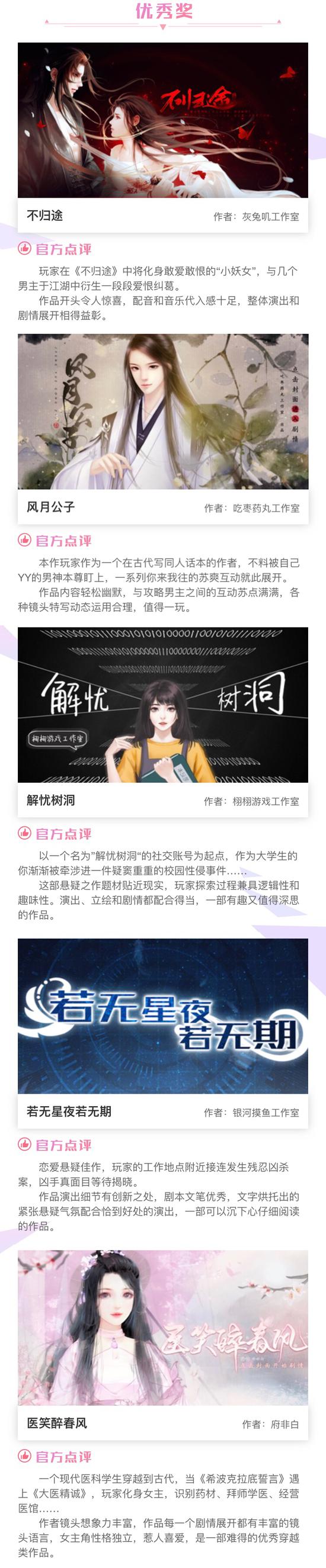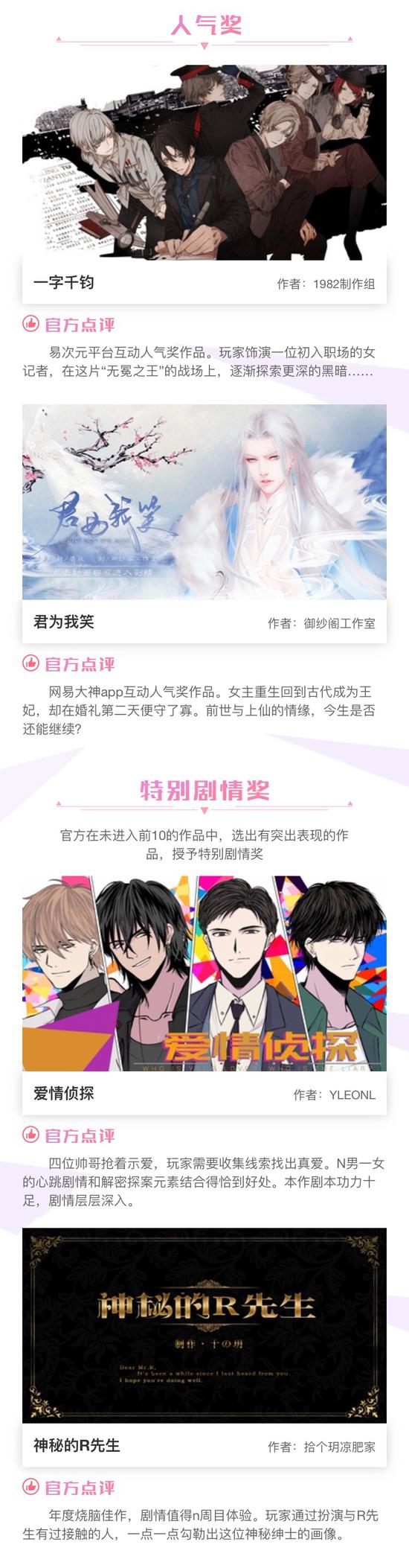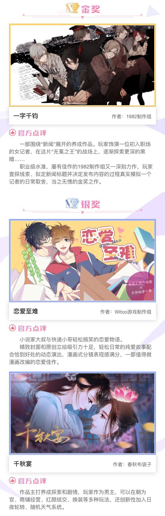 由网易游戏旗下互动阅读平台易次元(avg.163.com)发起的“首届制作大赛”正式落下帷幕。在短短的两个月时间内,大赛共收到八十多部参赛作品,经过一轮激烈的角逐,《一字千钧》凭借超优秀剧情和玩法夺得金奖和人气奖,《千秋宴》和《恋爱至难》紧随其后获得银奖,风格各异的《不称》《出闺阁记》和《山神娶亲》分别获得铜奖。除此之外大赛还设有优秀奖、特别剧情奖、参与奖,获奖的参赛选手将有计划获得超丰厚奖金和易次元签约机会等福利。详细获奖名单可到