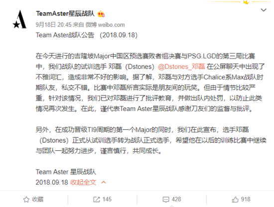 于是TeamAster官方发出公告,对于石头进行批评教育。同时石头也从实训选手转为战队正式选手。