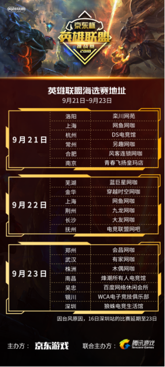 伴随着首周海选赛的落幕,京东杯电子竞技大赛S2英雄联盟挑战赛下一轮的战火即将再启。本周五至周日三天,京东杯电子竞技大赛S2英雄联盟挑战赛将在十八座城市再燃战火!如果你渴望舞台与荣誉,就千万不要错过本次京东杯电子竞技大赛S2的舞台,带上你的队友,向着总决赛的舞台和高额的赛事奖金发起冲击吧!