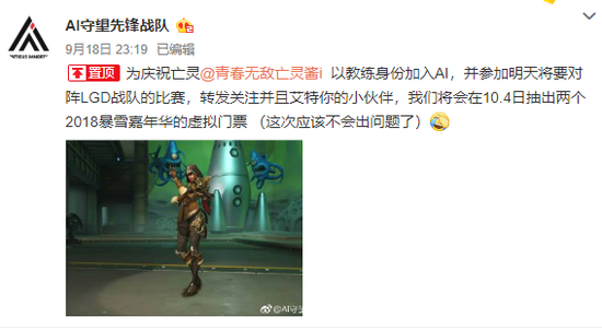 AI守望先锋战队微博公布原上海龙之队、霖感LGE战队队员亡灵以教练身份加入AI战队,并且此次是以免费教练的身份加入。