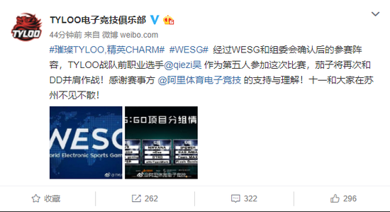 经过WESG和组委会确认后的参赛阵容,TYLOO战队前职业选手茄子qiezi将作为第五人参加这次比赛,茄子将再次和DD并肩作战!感谢赛事方阿里体育电子竞技的支持与理解!十一和大家在苏州不见不散!