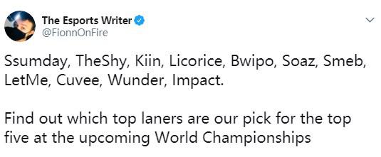入围的选手有:Ssumday、TheShy、Kiin、Licorice、Bwipo、Soaz、Smeb、LetMe、Cuvee、Wunder、Impact。LPL的两名上单选手入围后也确保进入了前五行列。