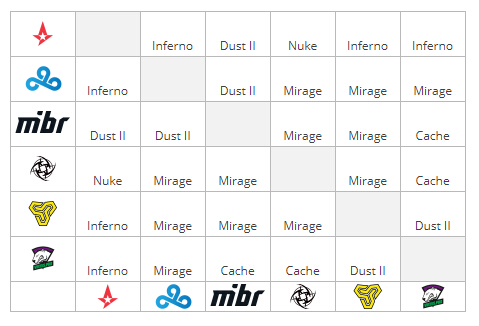 Blast Pro Series伊斯坦布尔站六支参赛战队将通过小组积分循环赛决出两支晋级决赛的队伍,小组积分循环赛采用BO1赛制,决赛则为BO3。与以往比赛不同的是地图BP在比赛开始前就已全部完成(除决赛),详细BP情况如下:
