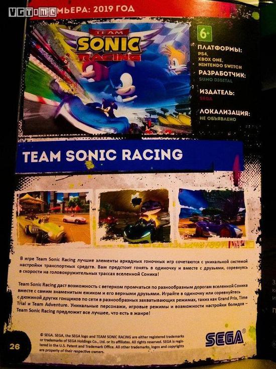 消息来源为俄罗斯地区的索尼克官方角色推特账号,他上传了一张科技会展 IgroMir Expo 的海报,海报上表明《索尼克团队赛车》将会于2019年发售。