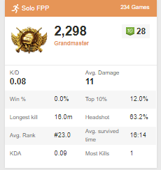 在共计234场第一人称下的单排比赛中,KD仅为0.08,前十率12%,最远击杀距离为十六米,最多击杀人数也只有一人。