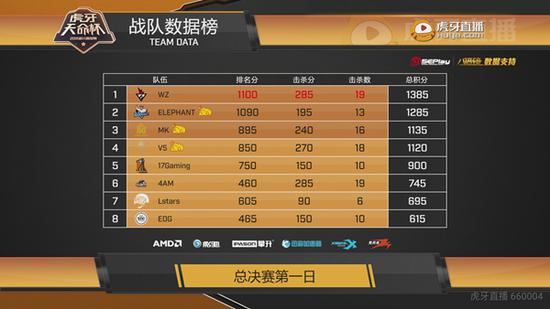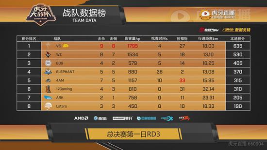 时间来到26分钟,场上还剩7队21人。WZ占据了圈的北部,周围没有其他队伍十分舒服。4AM选择侵入EDG领地但EDG已经先行转移,圈中V5清掉ARK,4AM无掩体只能平原冲锋也被带走。EDG在远处修脚带走elephant数人,蓝圈开始刷新,elephant先被EDG带走,EDG随后被WZ带走,决战时刻来临,WZ三人对阵V5三人。V5烟雾封住WZ视线,十分勇猛直接前进,一波坡射最终带走WZ成功吃鸡。